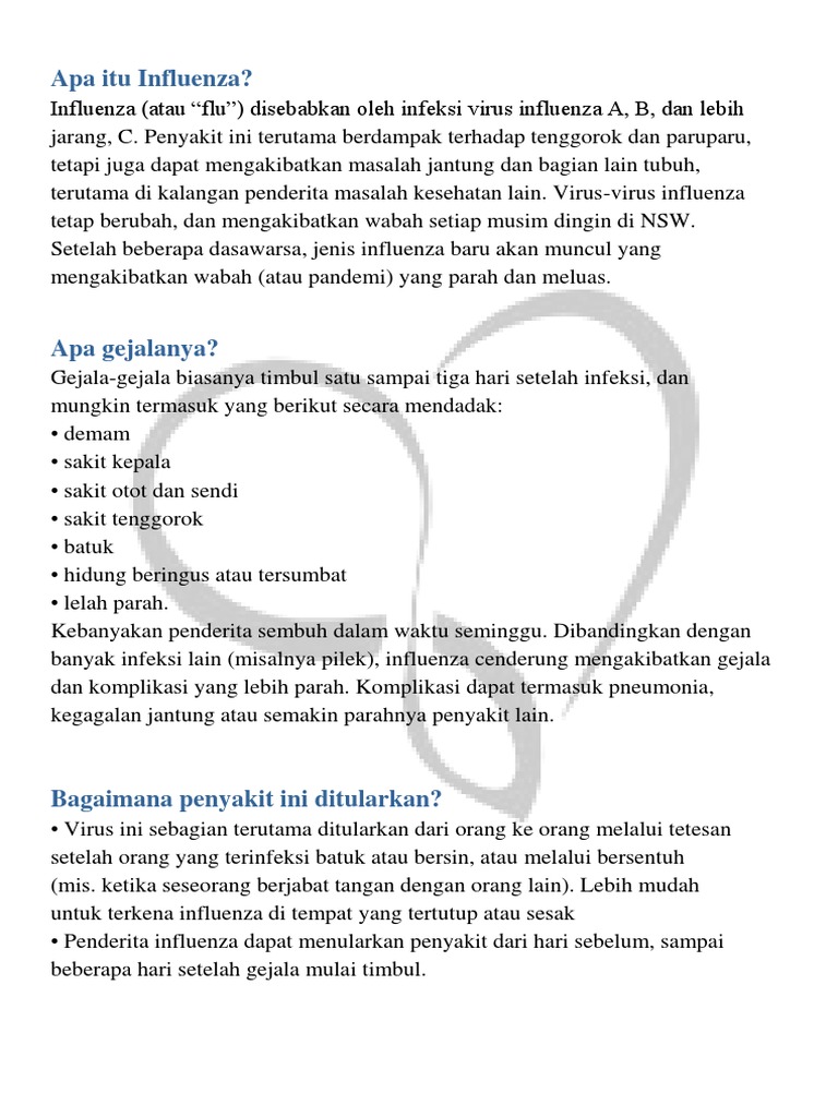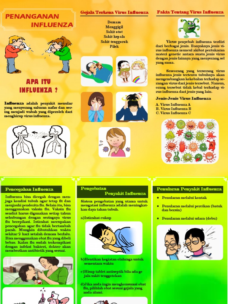 Symptoms range from mild to severe and commonly include fever, runny nose, sore throat, muscle pain. Membawa kepada gejala yang ringan kepada teruk adakala sehingga membawa maut. Zaman kini, kita selalu terdedah kepada cuaca dan keadaan sekitar yang kurang sihat., terutamanya kebelakangan ini mengenai influenza. Influenza yang dikenal sebagai flu adalah penyakit pernapasan yang sangat menular dan disebabkan oleh virus influenza tipe a, b dan bisa juga c. Influenza adalah infeksi saluran pernapasan yang disebabkan oleh virus influenza.